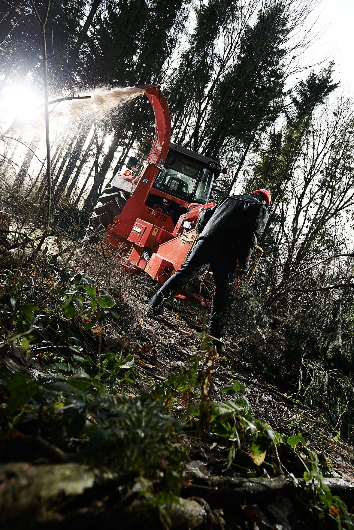 - A powerful wood chipper with hydraulic feed rollers and a chopping angle of 45° to ensure a large capacity and an aggressive in feed, also of whole trees